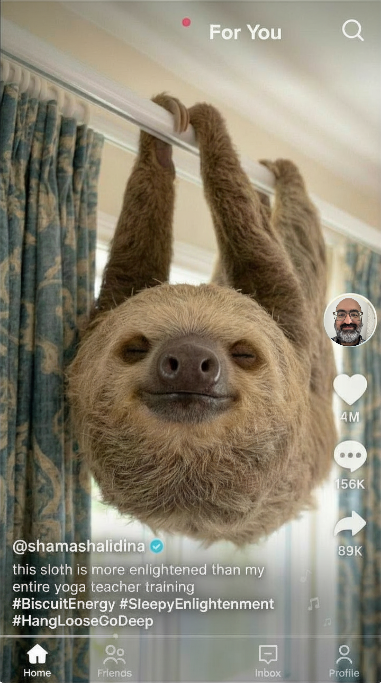Just thirty seconds. Biscuit hanging. Biscuit smiling. Lo-fi music. The caption: "this sloth is more enlightened than my entire yoga teacher training."